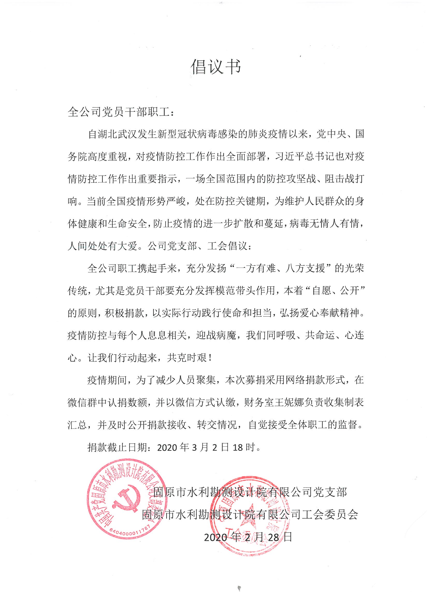 固原市水利勘測設(shè)計院有限公司為武漢疫情捐款